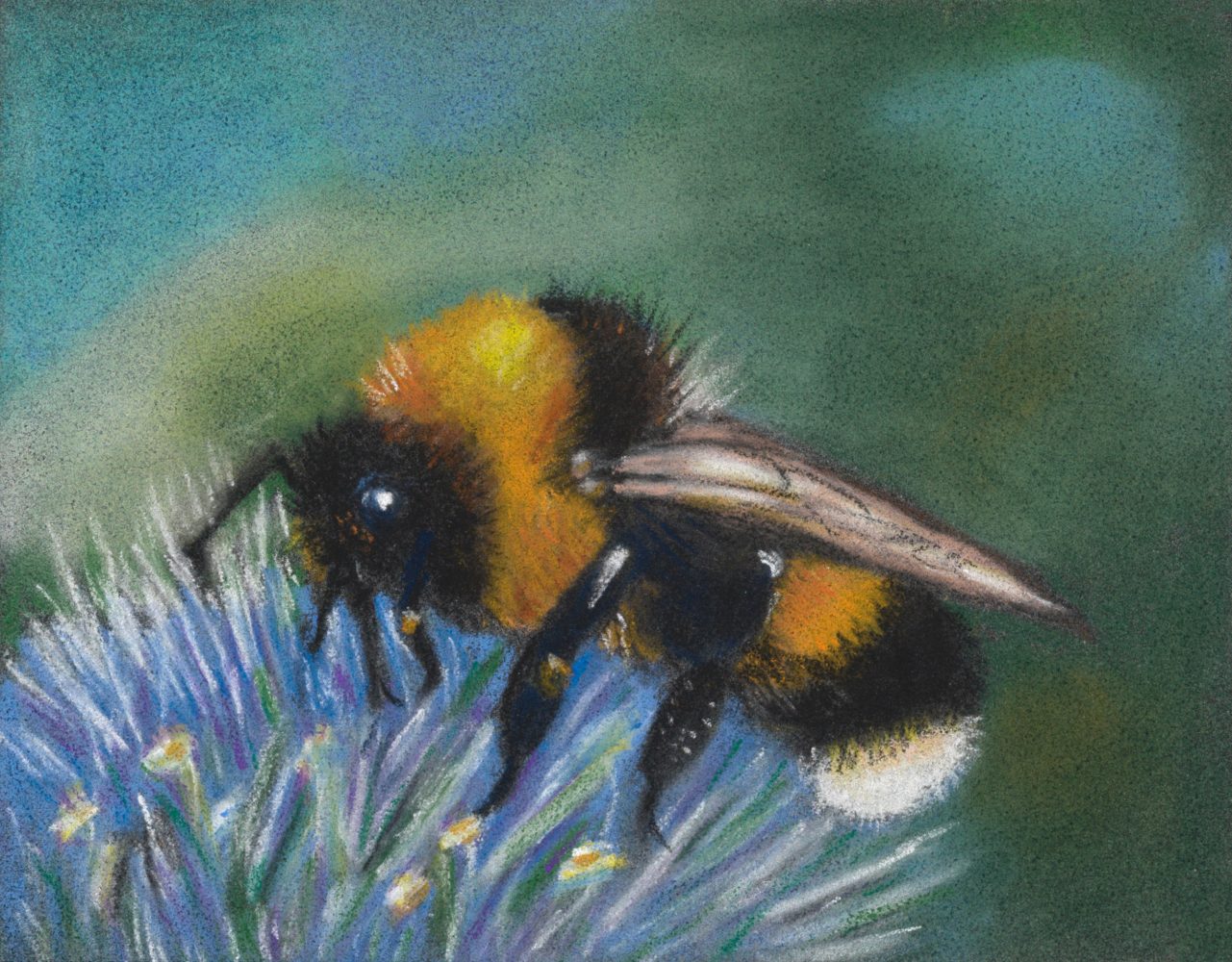 Pastel painting and wildlife portrait of a honey bee on a blue flower